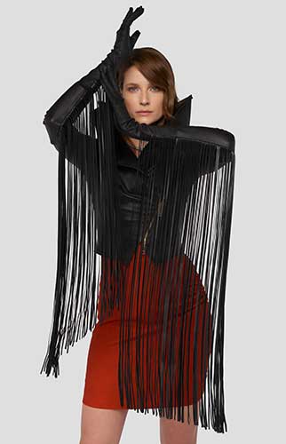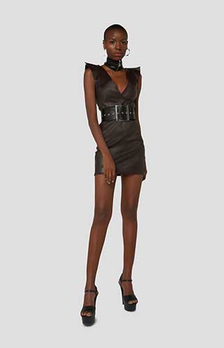 La collezione è formata da linee pulite e audaci, dettagli in pelle con frange da sogno e abiti con cerniere a vista che scolpiscono il corpo e sono abbinati a larghe cinture con fibbie quadrate.