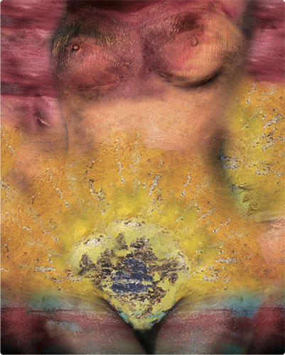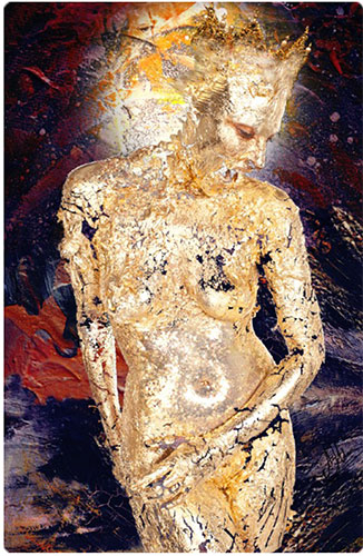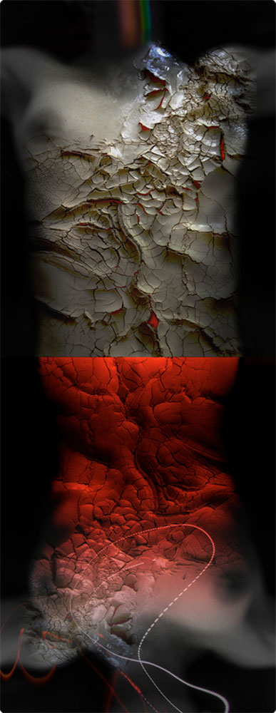 Alexandra Mas, artista prolifica, ha costruito la sua carriera in Francia. Quello che vedrete qui non è che una piccola parte del suo lavoro. Partendo dal disegno accademico, che padroneggia brillantemente, ha attraversato con bulimia un vasto registro di esplorazione visiva che passa necessariamente attraverso la fotografia e il video fino alle più abili manipolazioni digitali dell'immagine, alle performance o alla body art - lavori infatti con il proprio corpo o con quello di altri. La serie Aurore des Temps, di cui sono esposte alcune opere, converte deliberatamente l'estetismo in attivismo ecologico. Al di là di questo, mi piace vedere nelle figure delle attrici Aurore Tomé e Athule Mbekeni, stranamente modificate dalle loro vesti in foglia d'oro, dei richiami alle statue criselefantine dell'antichità. Come un nuovo re Mida, l'artista, che non smette di cercare un ideale di bellezza, sembra trasformare in oro tutto ciò che tocca, assumendo i rischi della reificazione. Ma l'occhio della modella, anche sommerso negli splendori e negli spostamenti cromatici, continua a guardare, vivace, affrontando dalla profondità cosciente, i molteplici strati di sottomissione e le costrizioni insidiosamente imposte sulla carne, sulla pelle e sui nostri corpi.